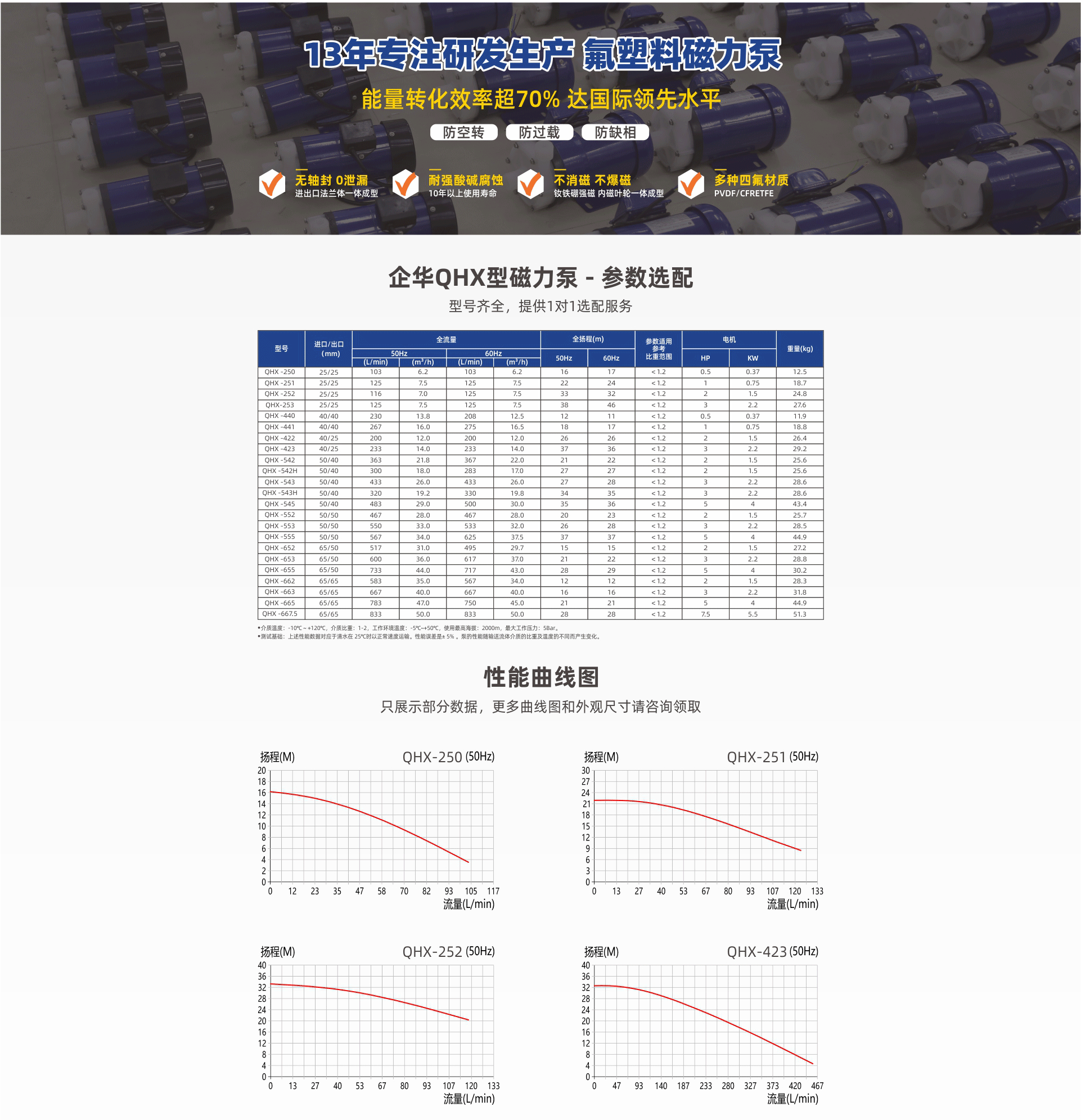 耐强腐蚀,进出口法兰一体成型专利滴水不漏;采用钦铁硼高效强磁不消磁,内磁叶轮体成型不爆磁;多种泵头材质、流量大震动小、噪音低,可另配“智能三防保护装置”,拒绝空转损坏。
