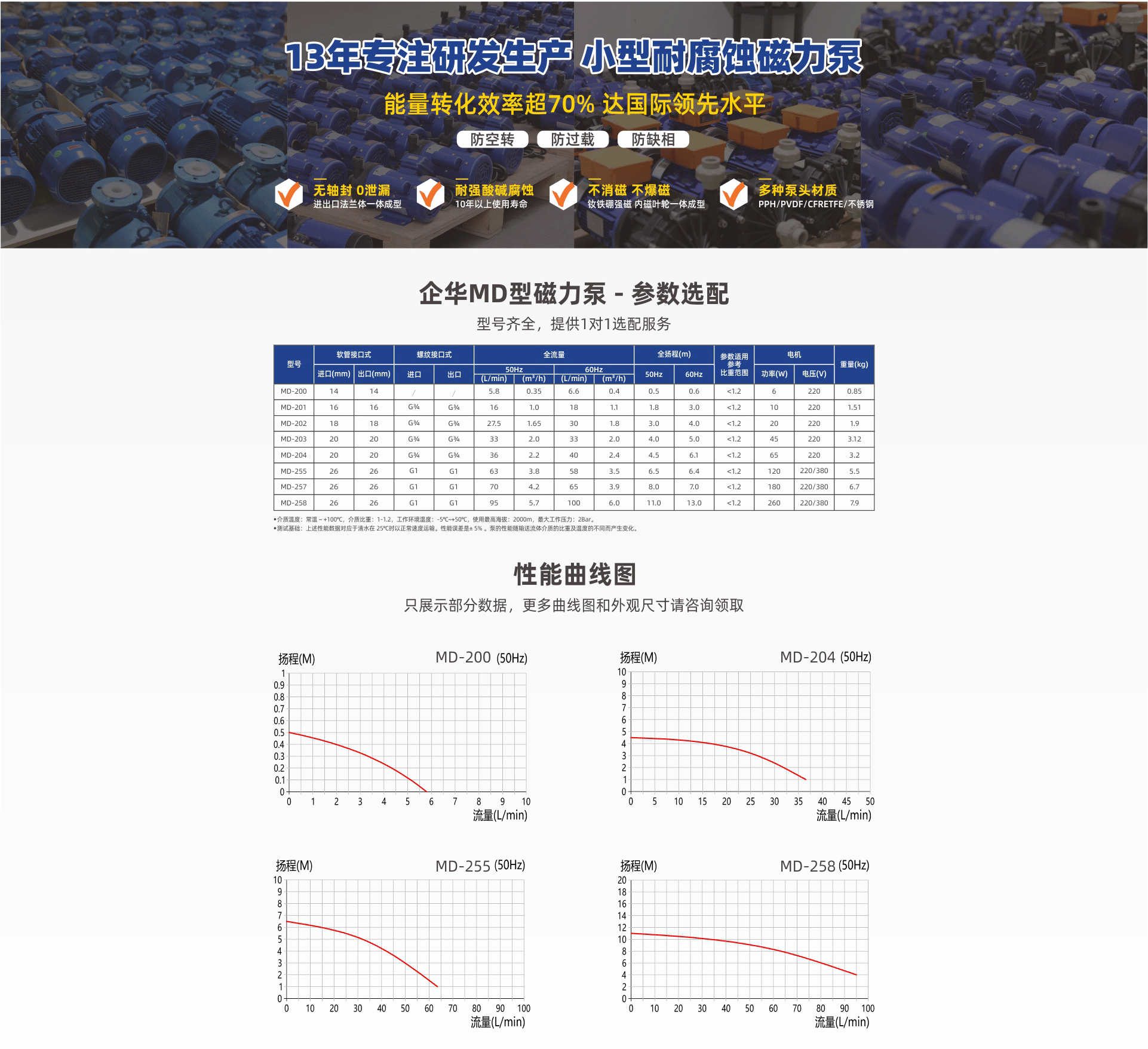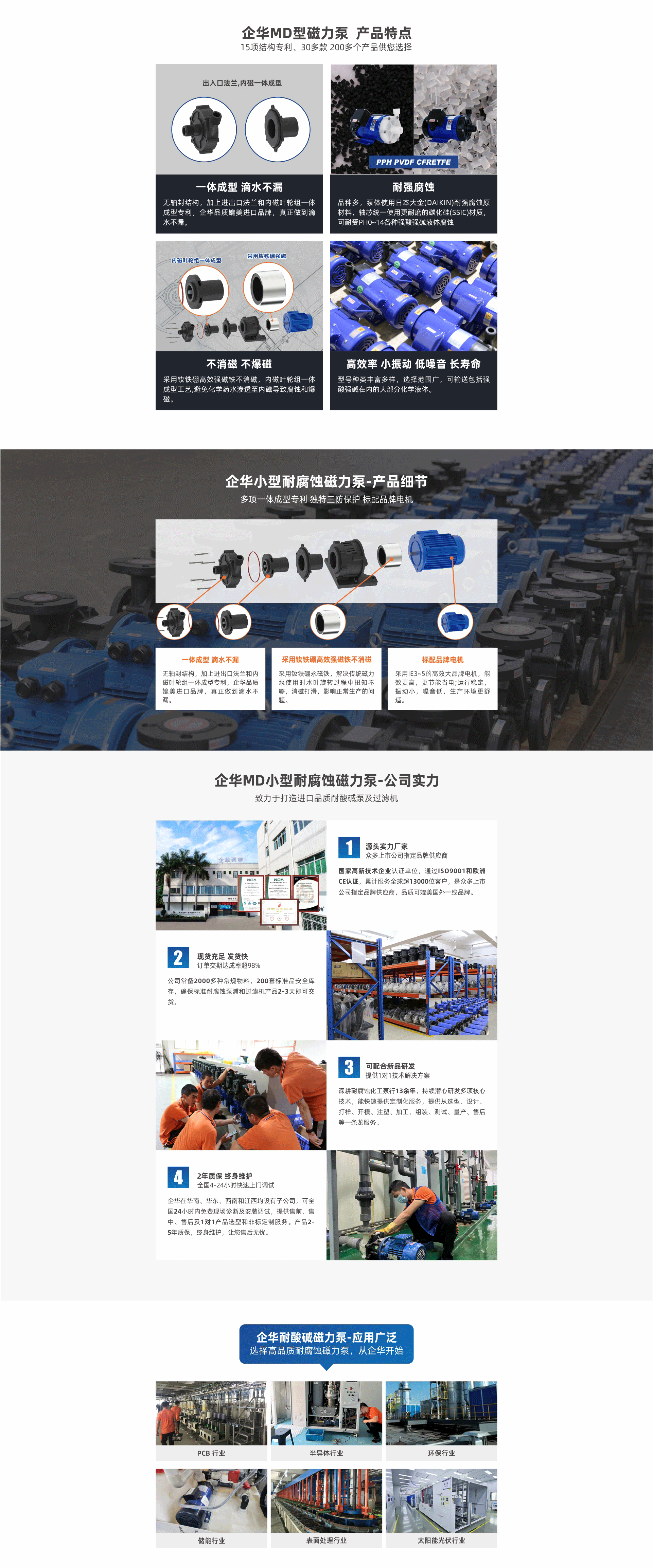 耐强腐蚀,进出口法兰一体成型专利滴水不漏;采用钕铁硼高效强磁不消磁,内磁叶轮一体成型不爆磁;多种泵头材质、体积小、振动小、噪音低、寿命长